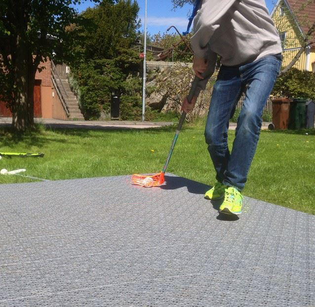 Det är möjligt att såga golvplattorna med en sticksåg när det behövs. Golvplattorna slås ihop med en gummihammare. Ytan kan användas inom- och utomhus året runt.