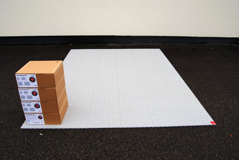 - Snabb omvandling och installation utan verktyg på betong, asfalt eller annan hård yta. Inga kemikalier eller lim behövs under installationen.